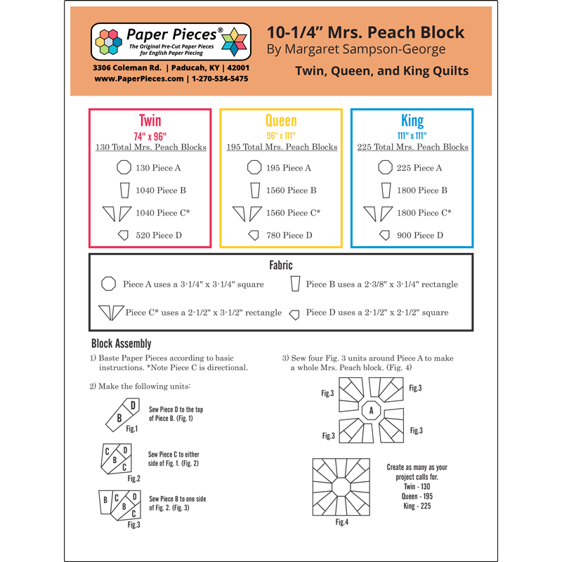 Design sheet for twin, queen or king size quilt using the 10-1/4" Mrs. Peach Block designed by Margaret Sampson George