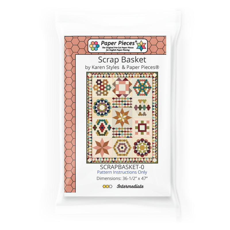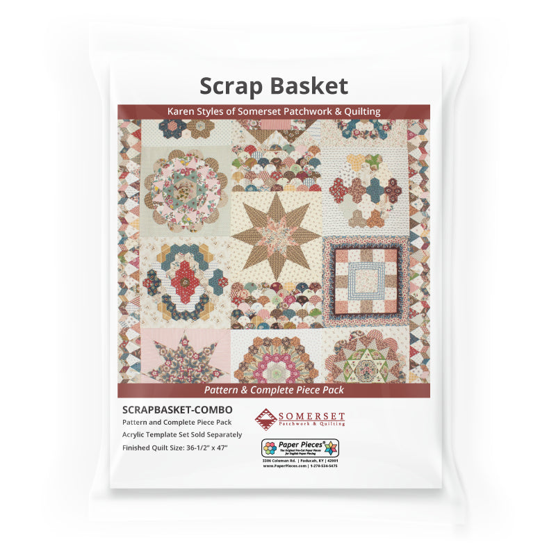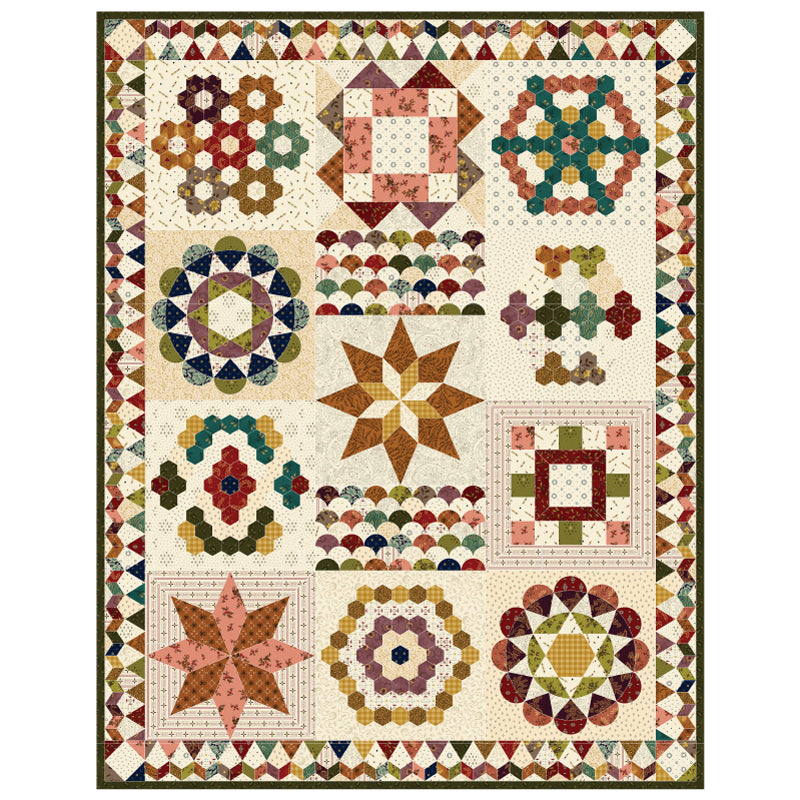 Scrap Basket is a charming sampler quilt that celebrates the beauty of well-loved fabrics. Karen Styles brings together some of her favorite blocks—like Devon Circle, clamshells, and creative hexagons. Made from scraps and stitched with love, this little quilt feels just like a gift from Grandma’s hands.