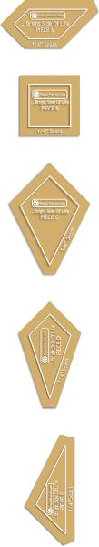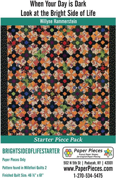 When Your Day is Dark Look at the Bright Side of Life Piece Packs and Acrylics. Pattern can be found in Millefiori Quilts 2 by Willyne Hammerstein Finished quilt is approx. 46-7/8" x 61" (118 cm x 154 cm) Starter Pack contains a little less than half of the Paper Pieces needed to start When Your Day is Dark Look at the Bright Side of Life. Pieces will need to be reused in order to complete the entire quilt as pictured in the book. Complete Piece Pack Includes ALL the Pre-Cut Papers, approximately 1551 pieces, to makeWhen Your Day is Dark Look at the Bright Side of Life: Piece A, B, C, D and E.5 PieceWhen Your Day is Dark Look at the Bright Side of LifeAcrylic Set includes shapes A, B, C, D and E and is available with a 3/8" or 1/4" seam allowance.