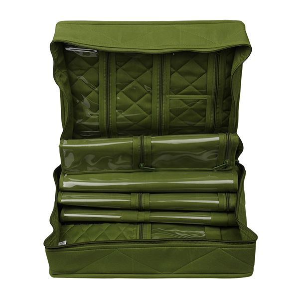 The Hand Quilter’s Project Bag has a front external horizontal-zippered across the cover of the bag for your keys, phone and other personal items. Inside the bag there are four sleeves and total of a 19 pockets, 18 of them see-through as well as a pen or tool storage section. The pockets are larger, with eight A5 pockets and four A4 pockets with others sizes to hold smaller tools and craft supplies. Size Closed : 33 X 26.5 X 12.5 cms / 13 X 10.5 X 5 inches