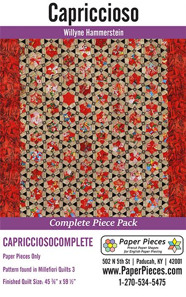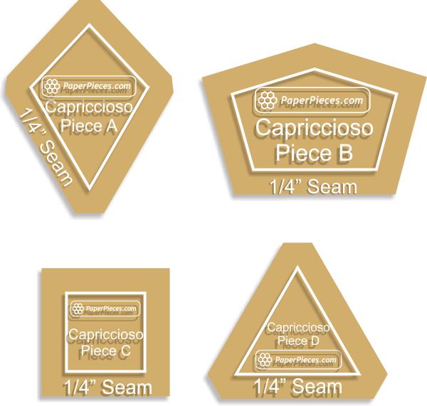 Capriccioso Paper Piece Packs and Acrylics. Pattern can be found in Millefiori Quilts 3 by Willyne Hammerstein Finished quilt is approximately 45-3/8" x 59-1/2" (115 cm x 151 cm) Complete Piece Pack Includes ALL the Pre-Cut Papers, approximately 1739 pieces, to make Capriccioso: Piece A, B, C, and D.4 Piece CapricciosoAcrylic Set includes shapes A, B, C, and D, and is available with a 3/8" or 1/4" seam allowance.