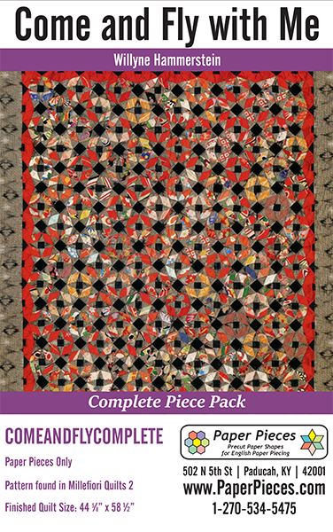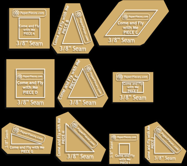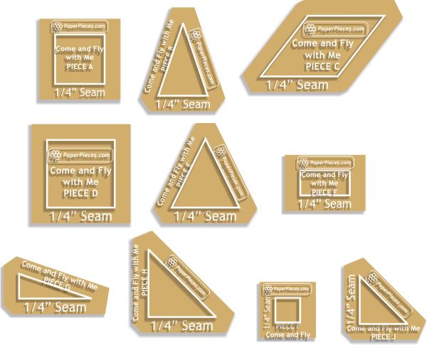 Come and Fly with Me Piece Packs and Acrylics. Pattern can be found in Millefiori Quilts 2 by Willyne Hammerstein Finished quilt is approx. 44-5/8" x 58-1/2" (114 cm x 150 cm) Complete Piece Pack Includes ALL the Pre-Cut Papers, approximately 2278 pieces, to make Come and Fly with Me: Piece A, B, C, D, E, F, G, H, I and J.10 Piece Come and Fly with Me Acrylic Set includes shapes A, B, C, D, E, F, G, H, I, and J and is available with a 3/8" or 1/4" seam allowance.