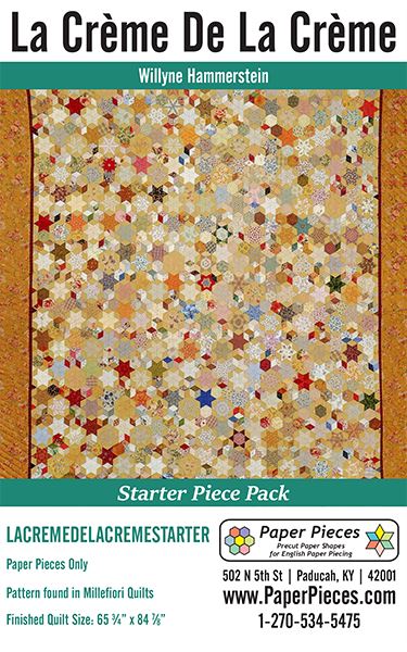 La Creme de la Creme Piece Packs and Acrylics. Pattern can be found in Millefiori Quilts by Willyne Hammerstein. Finished quilt is approx. 65-3/4" x 84-7/8" (167 cm x 215.5 cm) Starter Pack contains approximately half of the Paper Pieces needed to startLa Creme de la Creme. Pieces will need to be reused in order to complete the entire quilt as pictured in the book. Complete Piece Pack Includes ALL the Pre-Cut Papers, approximately 4780 pieces, to makeLa Creme de la Creme: Piece A, B, and C. 3 PieceLa Creme de la Creme Acrylic Set includes shapes A, B, and C and is available with a 3/8" or 1/4" seam allowance.