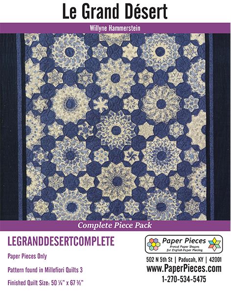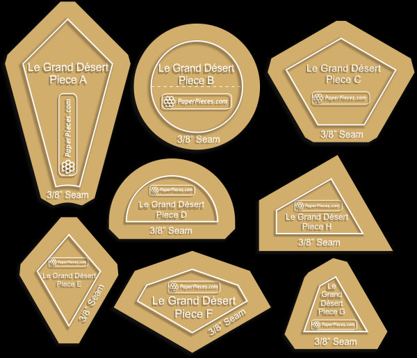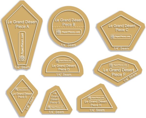 Le Grand Desert Paper Piece Packs and Acrylics. Pattern can be found in Millefiori Quilts 3 by Willyne Hammerstein Finished quilt is approximately 50-1/4" x 67-3/8" (126 cm x 170 cm) Complete Piece Pack Includes ALL the Pre-Cut Papers, approximately 885 pieces, to make Le Grand Desert: Piece A, B, C, D, E, F, G and H.8 Piece Le Grand Desert Acrylic Set includes shapes A, B, C, D, E, F, G, and H, and is available with a 3/8" or 1/4" seam allowance.