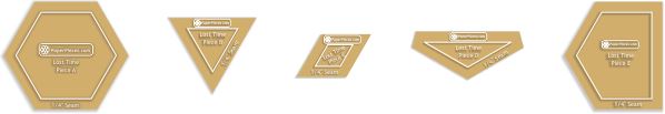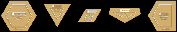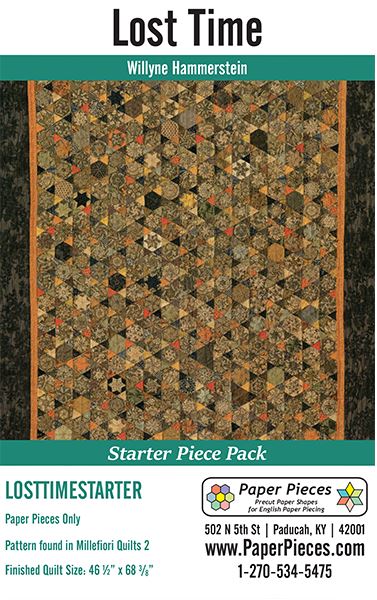 Lost Time Piece Packs and Acrylics. Pattern can be found in Millefiori Quilts 2 by Willyne Hammerstein Finished quilt is approx. 46-1/2" x 88-3/8" (120.5 cm x 173 cm) Starter Pack contains contains a little less than half of the Paper Pieces needed to start Lost Time. Pieces will need to be reused in order to complete the entire quilt as pictured in the book. Complete Piece Pack Includes ALL the Pre-Cut Papers, approximately 3100 pieces, to make Lost Time: Piece A, B, C, D and E.5 Piece Lost Time Acrylic Set includes shapes A, B, C, D and E and is available with a 3/8" or 1/4" seam allowance.