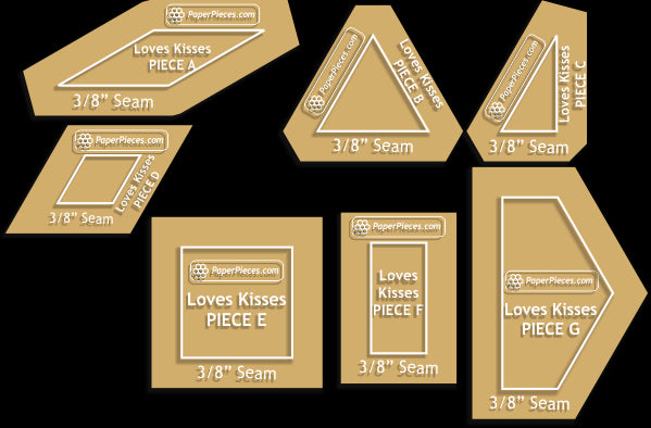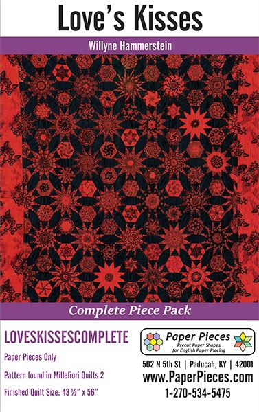 Love's Kisses Piece Packs and Acrylics. Pattern can be found in Millefiori Quilts 2 by Willyne Hammerstein Finished quilt is approx. 43-1/2" x 56" (110.5 cm x 142 cm) Complete Piece Pack Includes ALL the Pre-Cut Papers, approximately 1627 pieces, to make Love's Kisses: Piece A, B, C, D, E, F and G.7 Piece Love's Kisses Acrylic Set includes shapes A, B, C, D, E, F, G, and H and is available with a 3/8" or 1/4" seam allowance.