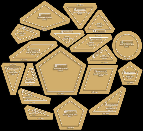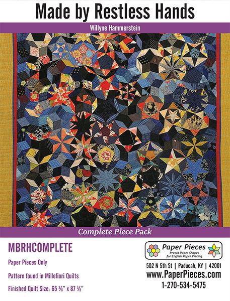 Made By Restless Hands Piece Pack and AcrylicsPattern can be found in Millefiori Quilts by Willyne Hammerstein. Finished quilt is approx. 65-3/8" x 87-5/8" (166 cm x 222.5 cm) Complete Piece Pack Includes ALLthe Pre-Cut Papers, approximately 1425 pieces, to make Made By Restless Hands: Piece A, B, C, D, E, F, G, H, I, J, K, L, M, N, O, P, Q and R. 18 Piece Made By Restless Hands Acrylic Set includes shapes A, B, C, D, E, F, G, H, I, J, K, L, M, N, O, P, Q and R and is available with a 3/8" or 1/4" seam allowance.