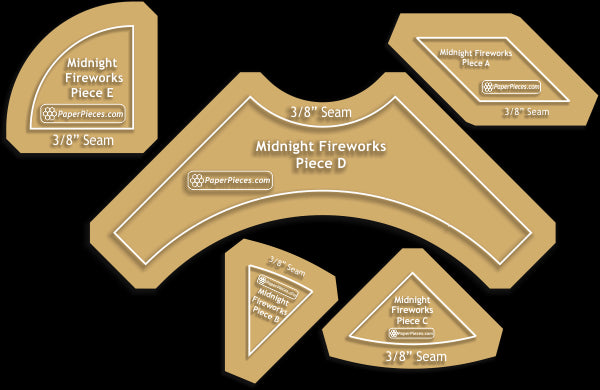 Midnight Fireworks Paper Piece Packs and Acrylics. Pattern can be found in Millefiori Quilts by Willyne Hammerstein. Finished quilt is approx. 56-1/4" x 66-3/8" (143 cm x 166 cm) Starter Pack contains a little less than half of the Paper Pieces needed to start Midnight Fireworks. Pieces will need to be reused in order to complete the entire quilt as pictured in the book. Complete Piece Pack Includes ALL the Pre-Cut Papers, approximately 1400 pieces, to make Midnight Fireworks: Piece A, B, C, D, and E.5 Piece Midnight Fireworks Acrylic Set includes shapes A, B, C, D and E and is available with a 3/8" or 1/4" seam allowance.