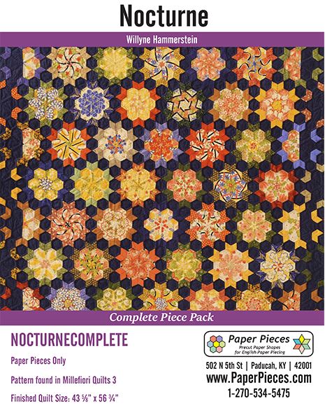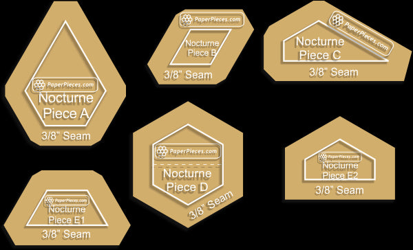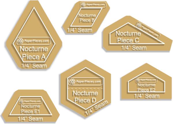 Nocturne Paper Piece Packs and Acrylics. Pattern can be found in Millefiori Quilts 3 by Willyne Hammerstein Finished quilt is approximately 43-5/8" x 56-3/4" (119 cm x 144 cm) Complete Piece Pack Includes ALL the Pre-Cut Papers, approximately 2275 pieces, to make Nocturne: Piece A, B, C, D, E1, and E2.6 Piece Nocturne Acrylic Set includes shapes A, B, C, D, E1, and E2, and is available with a 3/8" or 1/4" seam allowance.