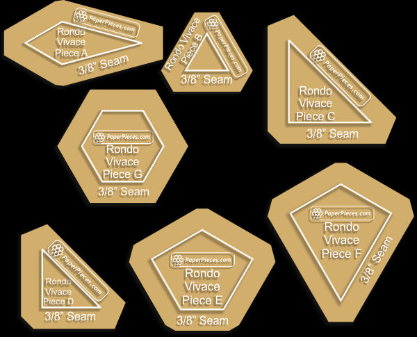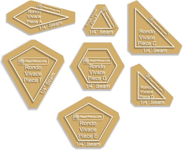 Rondo Vivace Paper Piece Packs and Acrylics. Pattern can be found in Millefiori Quilts 3 by Willyne Hammerstein Finished quilt is approximately 54-3/4" x 67" (139 cm x 170 cm) Complete Piece Pack Includes ALL the Pre-Cut Papers, approximately 2283 pieces, to make Rondo Vivace: Piece A, B, C, D, E, F, and G.7 Piece Rondo Vivace Acrylic Set includes shapes A, B, C, D, E, F, and G, and is available with a 3/8" or 1/4" seam allowance.
