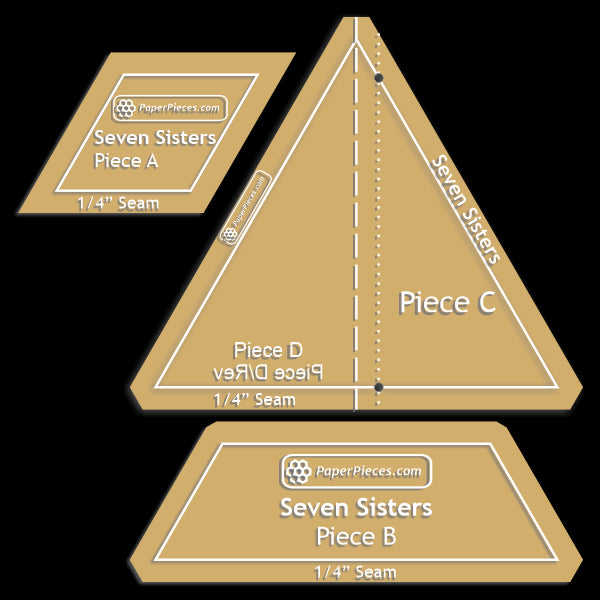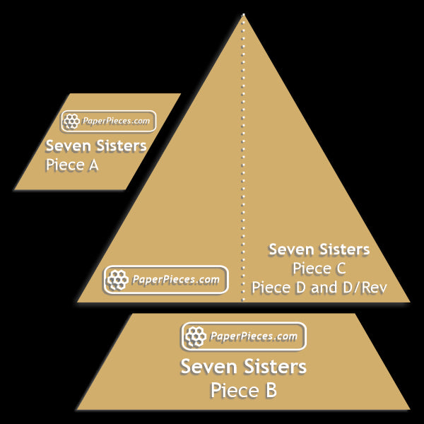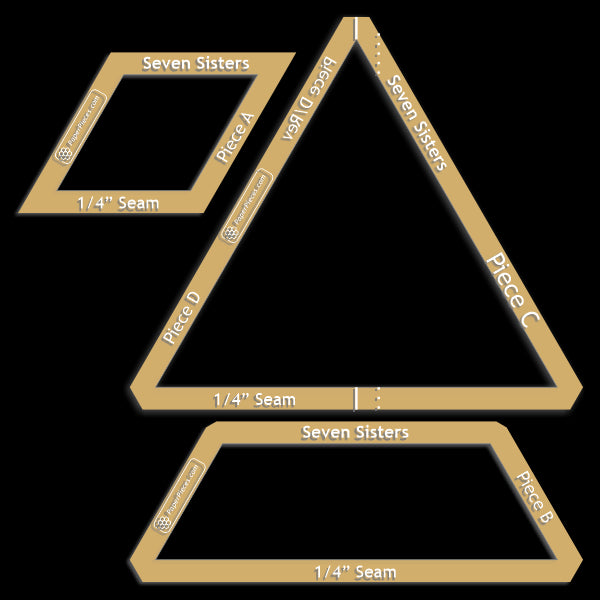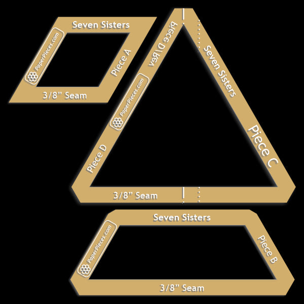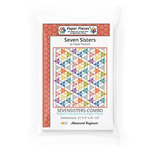 This pattern is a modern twist on a traditional Seven Sisters quilt pattern. Keeping with the original, each block is made using seven stars set together using six-point diamonds and finished using trapezoids. In this twist, diamonds are shared between the blocks and set with large triangles. This quilt is a great size for a lap, baby quilt, or as a wall hanging. Finished Size: 37-1/3" x 41-1/2"