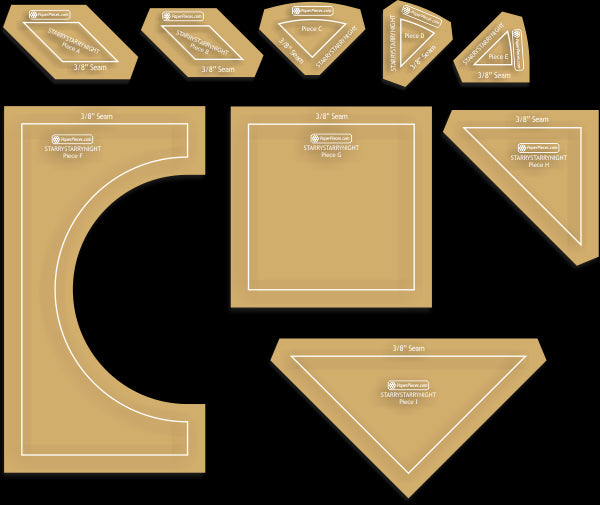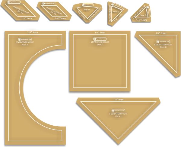 Starry Starry Night Piece Packs and Acrylics. Pattern can be found in Millefiori Quilts 2 by Willyne Hammerstein Finished quilt is approx. 58" x 69-1/2" (147 cm x 177.5 cm) Complete Piece Pack Includes ALL the Pre-Cut Papers, approximately 2340 pieces, to make Starry Starry Night: Piece A, B, C, D, E, F, G, H, and I.9 Piece Starry Starry Night Acrylic Set includes shapes A, B, C, D, E, F, G, H, and I and is available with a 3/8" or 1/4" seam allowance.
