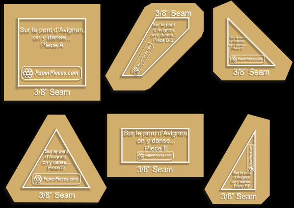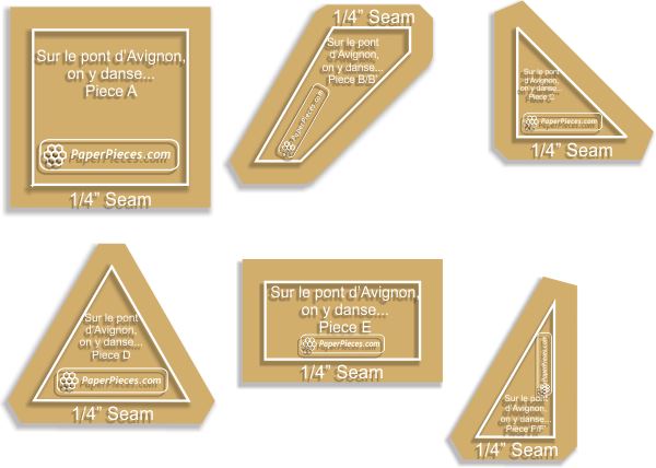 Sur le pont d'Avignon on y Danse Paper Piece Packs and Acrylics. Pattern can be found in Millefiori Quilts 3 by Willyne Hammerstein Finished quilt is approximately 48" x 58" (121.5 cm x 147 cm) Complete Piece Pack Includes ALL the Pre-Cut Papers, approximately 923 pieces, to make Sur le pont d'Avignon on y Danse: Piece A, B, C, D, E, and F, following the instructions for the solid Unit A center using the square A.6 Piece Sur le pont d'Avignon on y DanseAcrylic Set includes shapes A, B, C, D, E. and F, and is available with a 3/8" or 1/4" seam allowance.