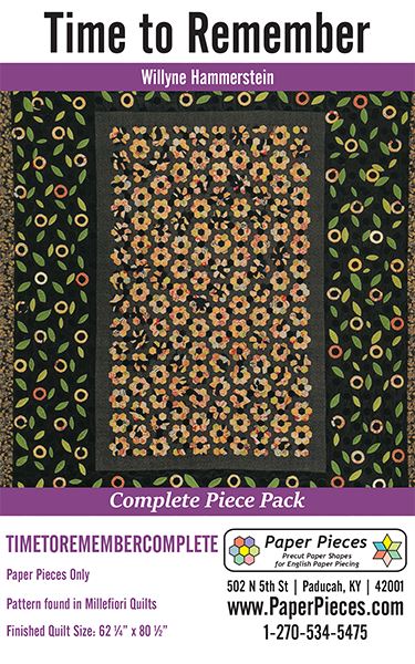 Time to Remember Paper Piece Packs and Acrylics. Pattern can be found in Millefiori Quilts by Willyne Hammerstein. Finished quilt is approx. 62-1/4" x 80-1/2" (158 cm x 204.5 cm) Complete Piece Pack Includes ALL the Pre-Cut Papers, approximately 1738 pieces, to make the center of Time to Remember: Piece A. Does not include the border applique pieces. 1 Piece Acrylic Template includes shapes A only and is available with a 3/8" or 1/4" seam allowance.