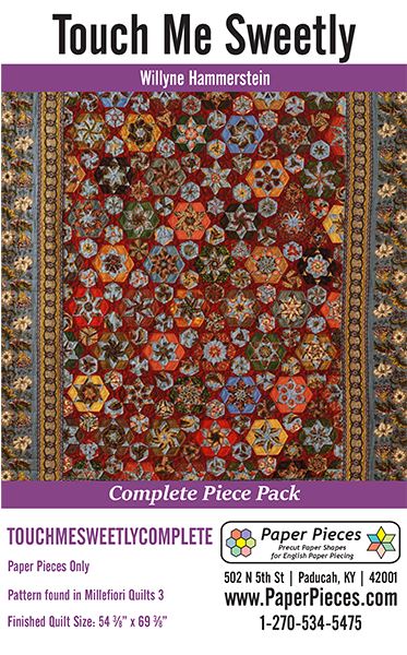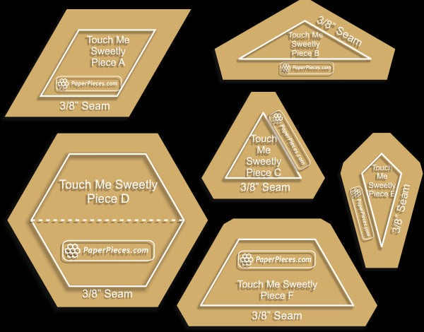 Touch Me Sweetly Paper Piece Packs and Acrylics. Pattern can be found in Millefiori Quilts 3 by Willyne Hammerstein Finished quilt is approximately 54-3/8" x 69-3/8" (138 cm x 176 cm) Complete Piece Pack Includes ALL the Pre-Cut Papers, approximately 1316 pieces, to make Touch Me Sweetly: Piece A, B, C, D, E, and F, following the instructions for the solid inner block center using the hexagon D.6 Piece Touch Me Sweetly Acrylic Set includes shapes A, B, C, D, E, and F, and is available with a 3/8" or 1/4" seam allowance.