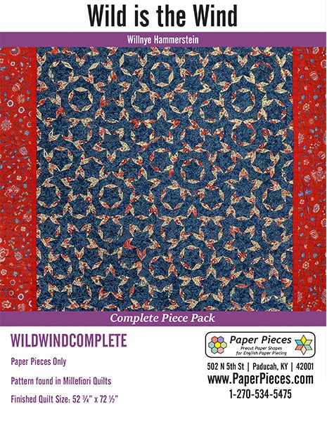 Wild is the Wind Paper Piece Packs and Acrylics. Pattern can be found in Millefiori Quilts by Willyne Hammerstein. Finished quilt is approx. 52-3/4" x 72-1/2" (134 cm x 184 cm)