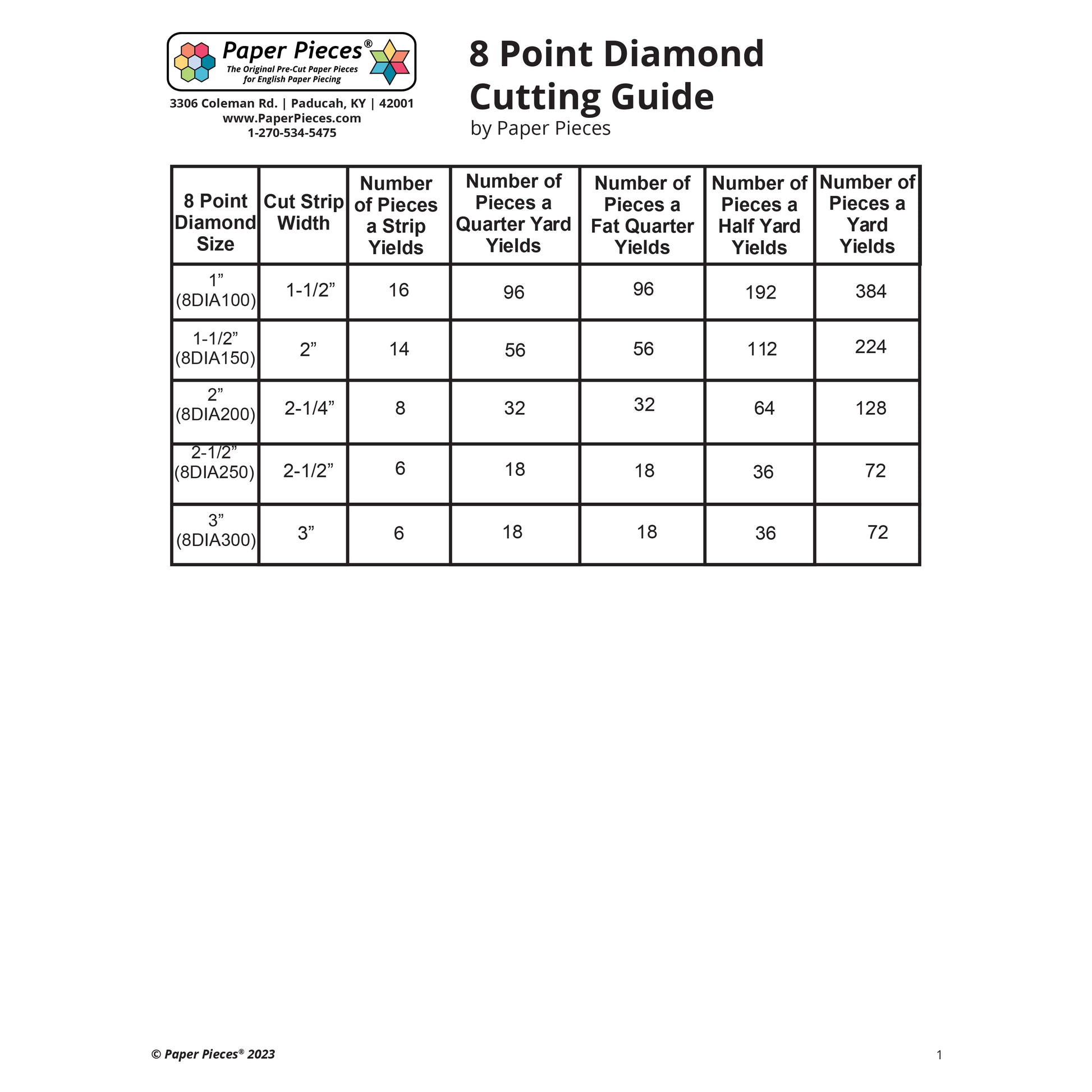 Reference this cutting guide when cutting popular 8 Point Diamonds (45 Degree Diamonds) to get the most out of your fabric!