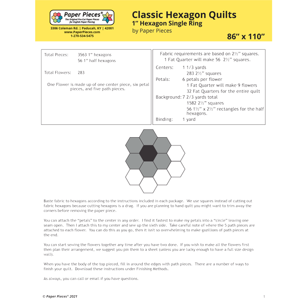 Classic 1" Hexagon Single Ring Grandmother's Flower Garden Pattern (FREE PDF Download) by Paper Pieces®