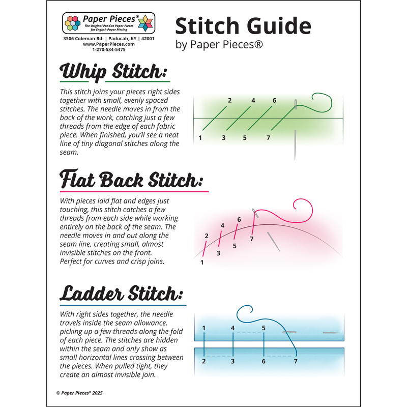 Master the three most popular stitches for English Paper Piecing with our handy Stitch Guide. This free resource shows step-by-step diagrams and clear explanations for the Whip Stitch, Flat Back Stitch, and Ladder Stitch—so you can choose the method that fits your project best. Perfect for beginners and seasoned stitchers alike, this guide will help you create clean, secure seams with confidence.